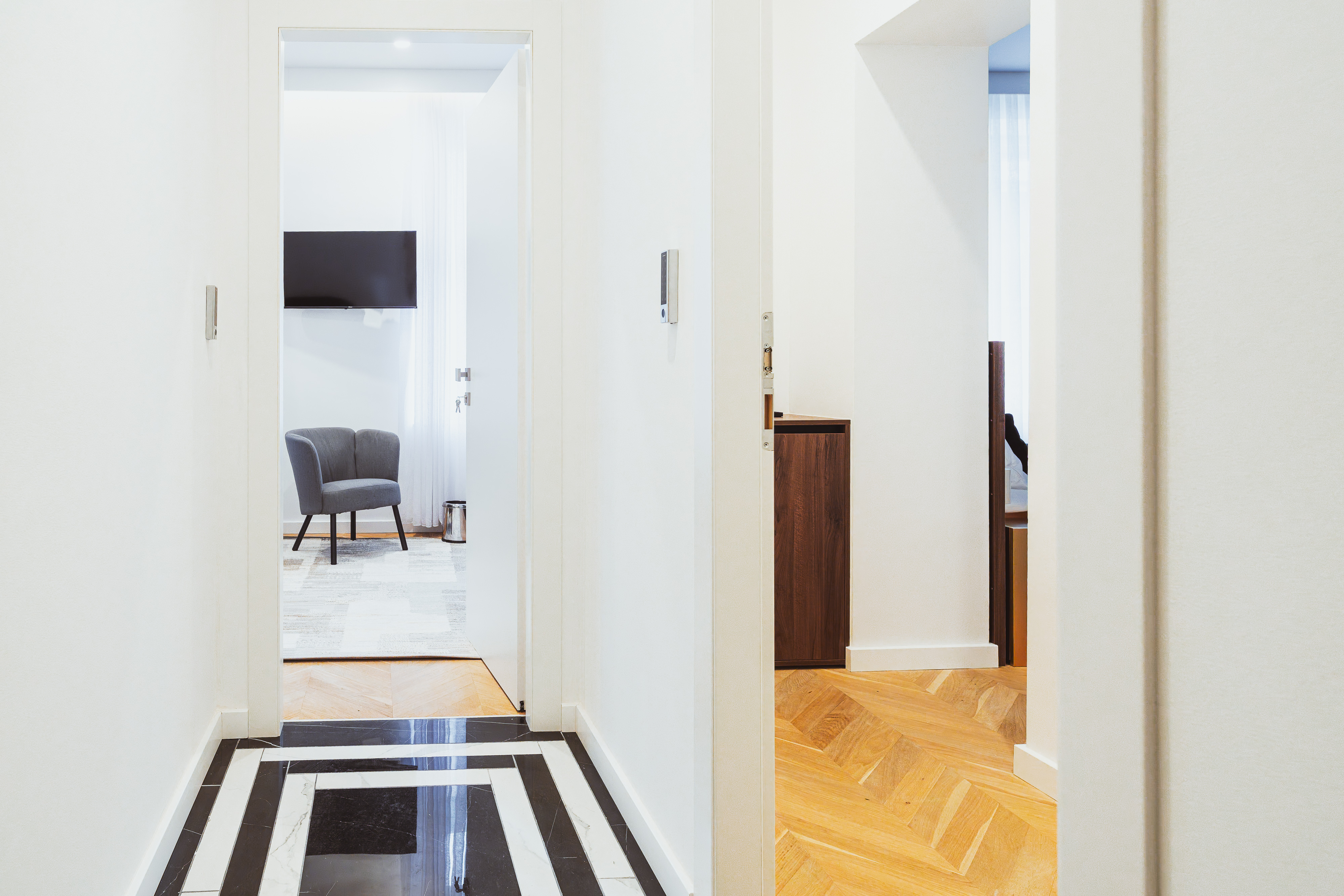 Ulaz u apartman osiguran je tipkovnicom za unos lozinke.